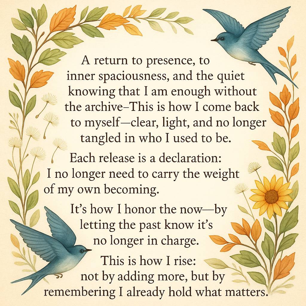 I’m teaching my brain that I no longer need to preserve everything to be wise. I’m teaching my nervous system that clarity lives in presence — not in paper.